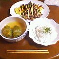 と、いうことでカンタンにタマネギと溶きたまごのみそ汁、ポテトサラダ、ナスの甘辛煮とナスの浅漬けを作って夕食の準備が整った。